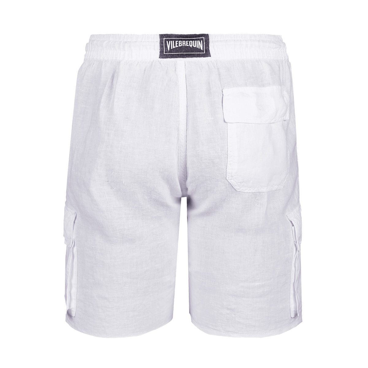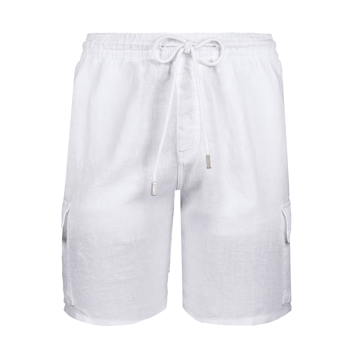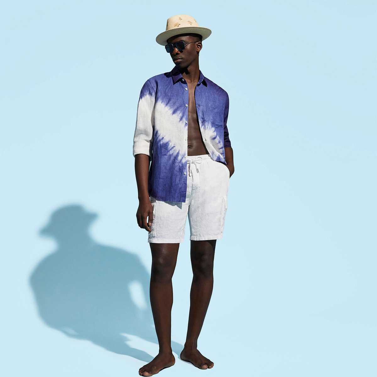 Esnek ve rahat keten kumaştan üretilen, zamansız ve rahat erkek bermuda şortları, Vilebrequin koleksiyonunun önemli bir parçasıdır.