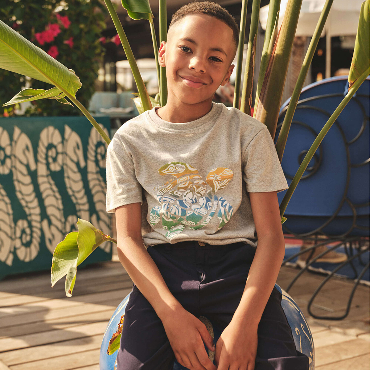Plajda geçireceğiniz rahat günler için, rahat organik pamuklu jarseden üretilen bu çocuk tişörtünün ön kısmında göz alıcı bir baskı bulunuyor. Bu ürün koleksiyondaki şortlar ile mükemmel şekilde kombinlenebilir.