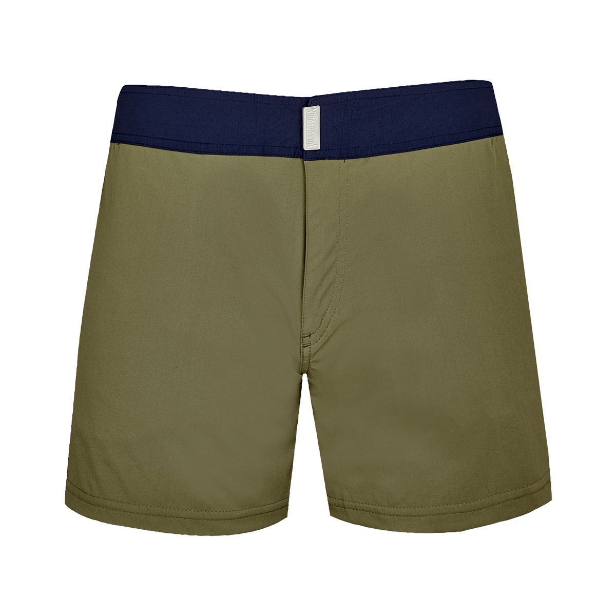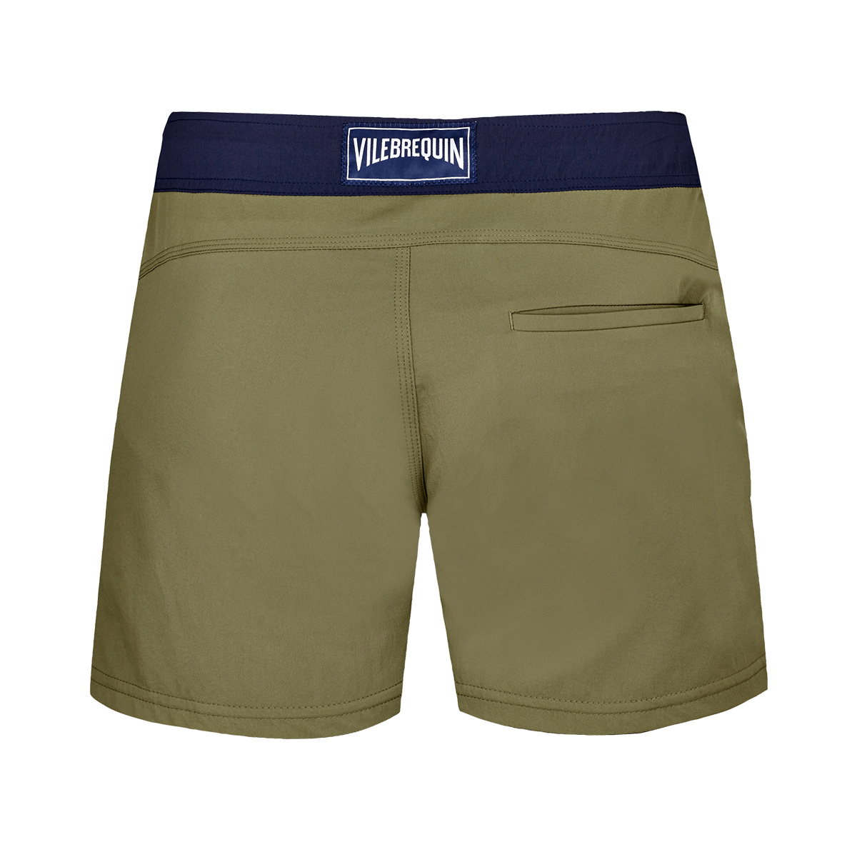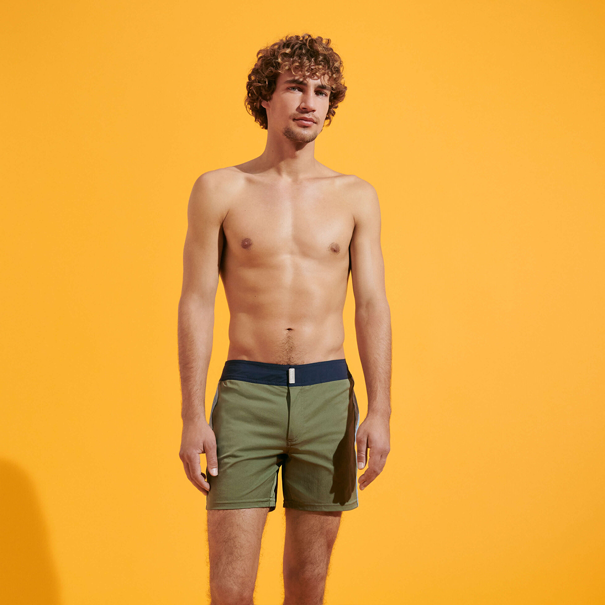 Çabuk kuruyan streç kumaştan üretilen Merle üç renkli erkek yüzme şortları, Vilebrequin logolu dikdörtgen bir düğmeyle sabitlenen, kontrast oluşturan düz bir bel bandına sahiptir. Yanlardaki bantlar cepleri vurgular. Bu yüzme şortları ayrıca cırt cırtlı bir arka cebe sahiptir.