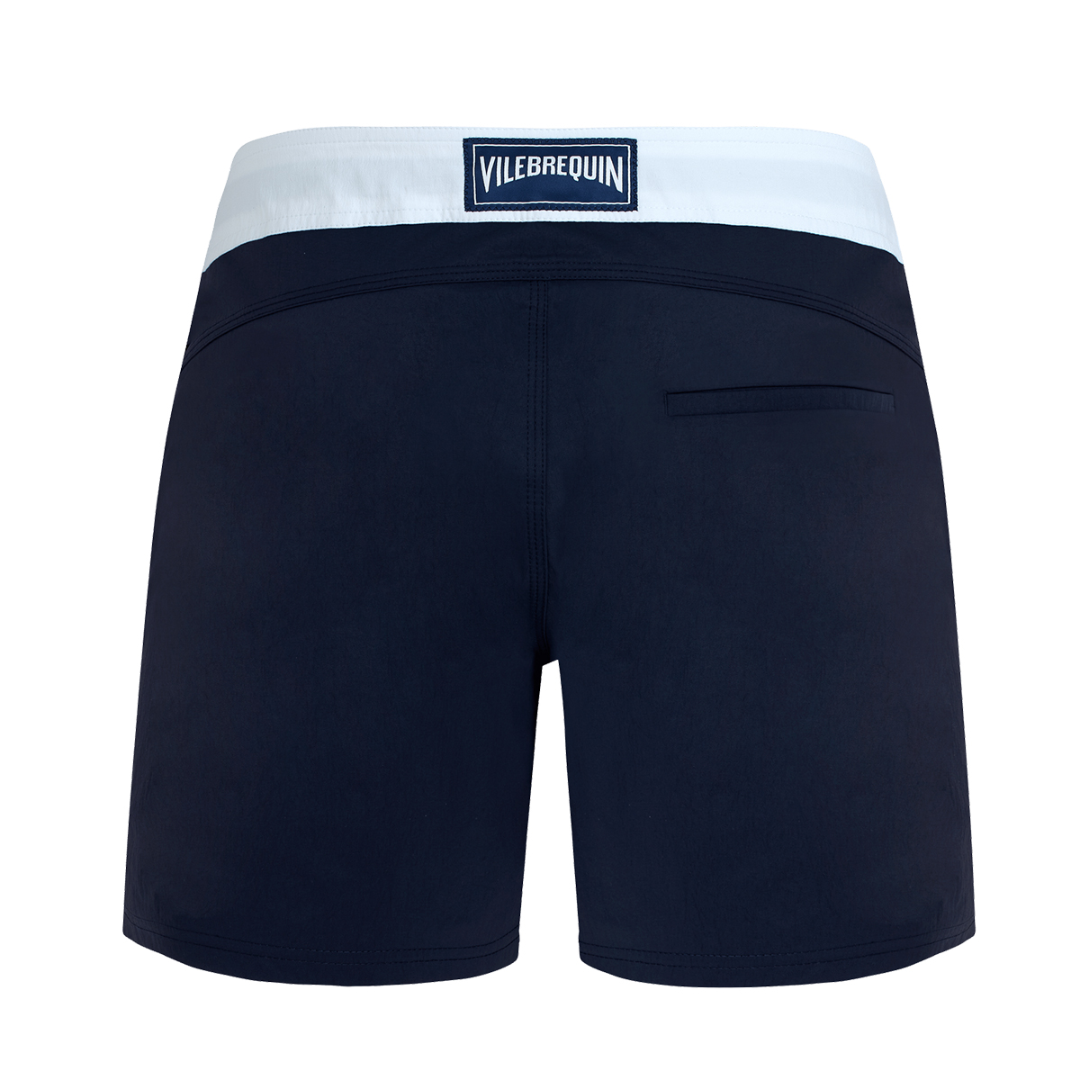 Çabuk kuruyan streç kumaştan üretilen Merle üç renkli erkek yüzme şortları, Vilebrequin logolu dikdörtgen bir düğmeyle sabitlenen, kontrast oluşturan düz bir bel bandına sahiptir. Yanlardaki bantlar cepleri vurgular. Bu yüzme şortları ayrıca cırt cırtlı bir arka cebe sahiptir.