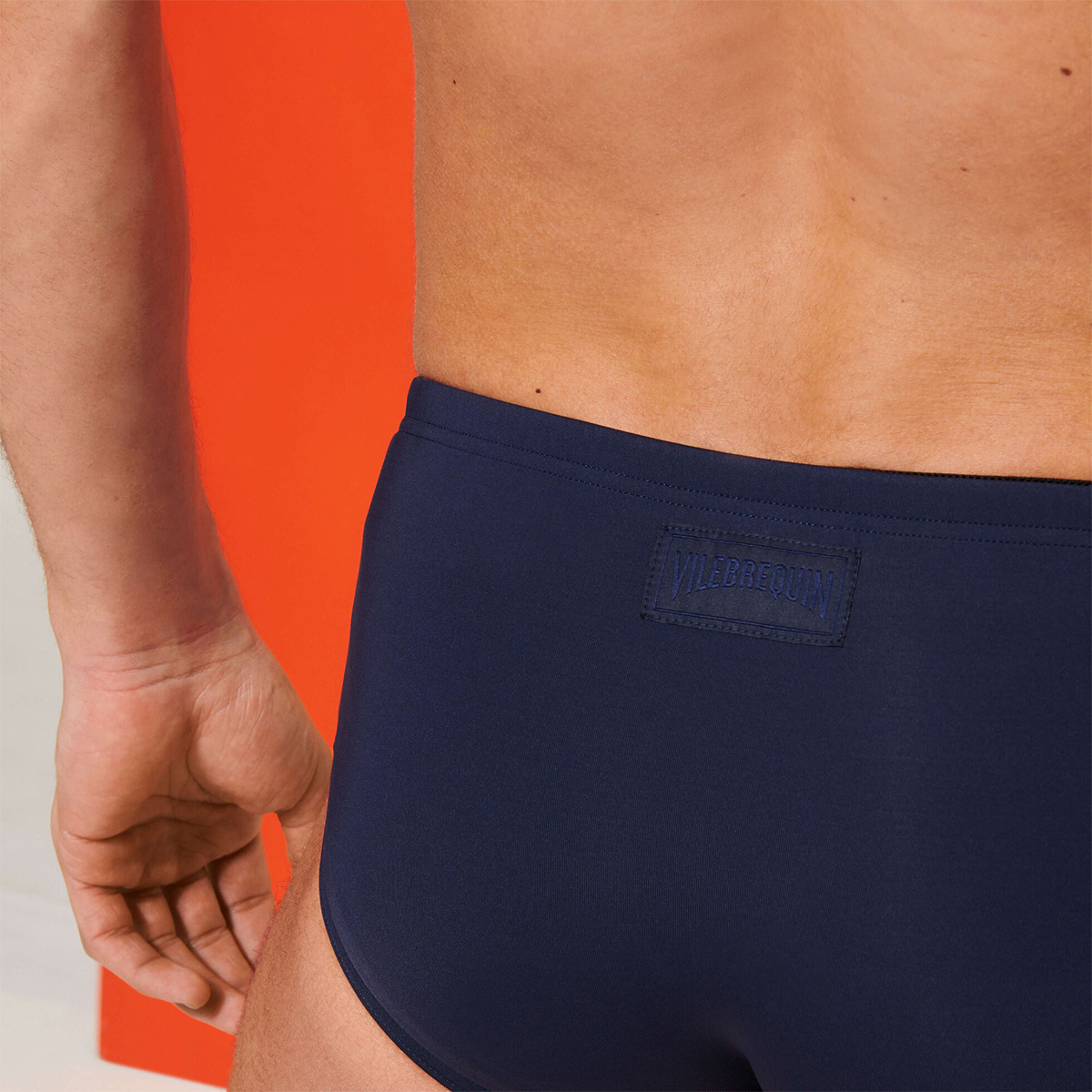 Vilebrequin detayları, Nuage erkeklerinin düz slip mayolarda, ön kısımdaki vücut şekillendirme dikişleriyle parlıyor. Rahat kumaştan yapılmış, ultra hızlı kuruyan bu vücut şekillendirici mayo, rakipsiz derecede basit ama şık bir stil için ipli elastik bir bel bandına sahiptir.