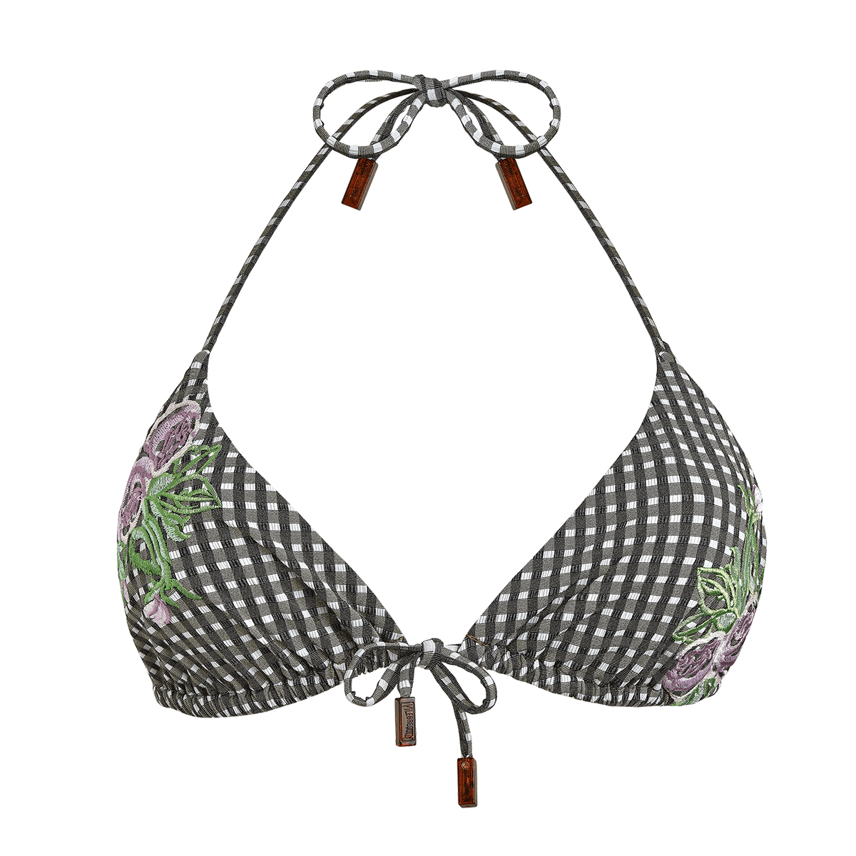 St. Tropez havasını çağrıştıran, çiçek işlemeli bu kareli bikini üstü poliamid ve elastandan üretilmiştir.
