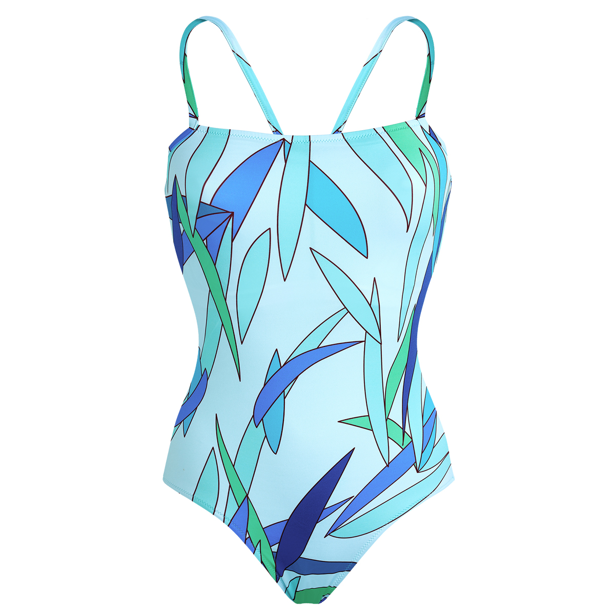 Arkası iki parça görünümünde, renkli tasarımlı, şık tek parça mayo.