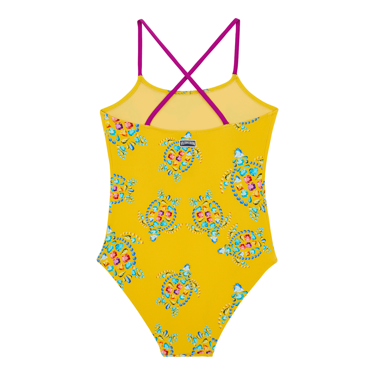 Yazı bu baskılı kız çocuk mayosuyla kucaklayın. Çapraz omuz askılarına sahip bu şık parça, geri dönüştürülmüş poliamid ve elastandan üretilmiştir.